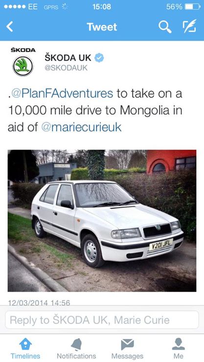 Purchasing a car unseen on ebay is almost certainly a bad idea. Even more so if you’re hoping to then drive it ten thousand miles across who-knows-what to Mongolia. But then again, £600 quid for a Skoda Felicia with only 37,000 miles on the clock seemed like a good deal, so we decided to go for it anyway. Plus it was white, and we thought the team logo would look nice on white. In such situations it’s important that you get someone with a sound knowledge of motor vehicles to check out the relevant worky-bits before handing over any cash.