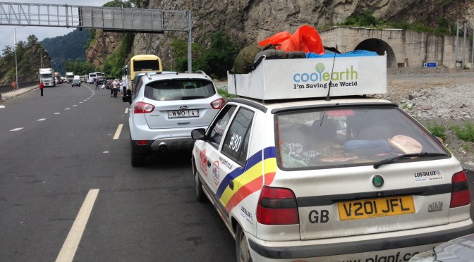 It was a relatively short drive to the Georgian border and as we came out of the tunnel we could see Georgian immigration right in front of us, great! The police quickly pissed all over our parade as they used their PA system to shout at us in Turkish to join the back of the queue. We turned the corner and saw that the queue doubled back and went on for miles, we knew then we were in for a long one! Things could have been worse though, we were parked right next to the Black Sea, the sun was shining and there was the prospect of beers on the other side of the border!! Slowly but steadily we moved up the queue with the Turks shouting “Yanesh, Yanesh” which we understood to mean “Closer, Closer” – we got pretty close to the car in front but the friendly Turk in the car behind wasn’t happy until his car was physically touching ours, only then was he happy he was close enough, he didn’t damage either car though and we just kept laughing at him and he seemed to think it was pretty funny too. Whilst in the queue, Don befriended a local Turk who for $100 said he could get us straight to the front of the queue as his uncle was in charge of the border, we politely declined the offer and chose to wait it out like the rest of the people. We also met Jalal, a nice guy from Baku in Azerbaijan who was on his way back there to meet his family, he spoke really good english so we asked him about Baku and asked if he knew anything about getting visas at the border to which he said, sadly not. Bugger, thats Plan B out the window! I got bored of the queuing and went for a swim, Al got bored of the driving and so we left Rob in charge of the car and just took the handbrake off and pushed it every time we heard the shout of “Yanesh, Yanesh”.