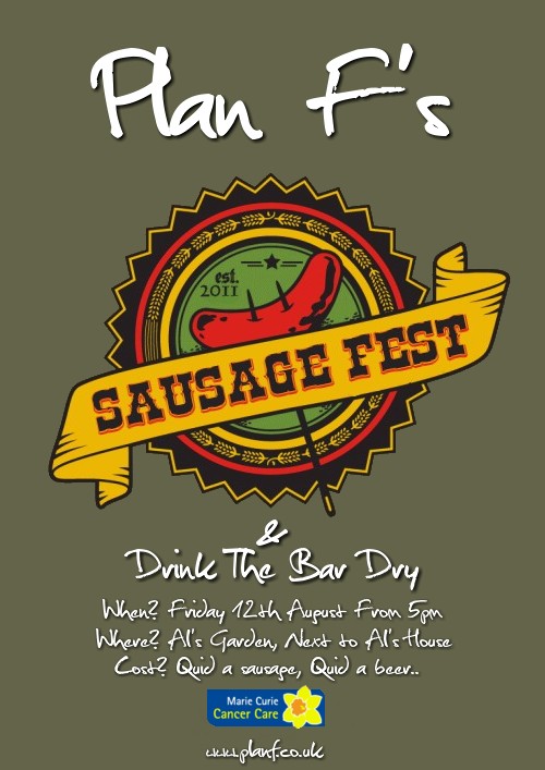 Details? Fear not ladies, you do not need a penis to have an invite to this next social gathering hosted by the Plan F Boys! After the massive success of the Plan F All-You-Can-Eat BBQ where we raised over £200 and partied on until 4:30 in the morning we’ve decided to host a ‘Sausage Fest’. The aim of the evening is to finish off the 60 sausages we have and to Drink-The-Bar-Dry.