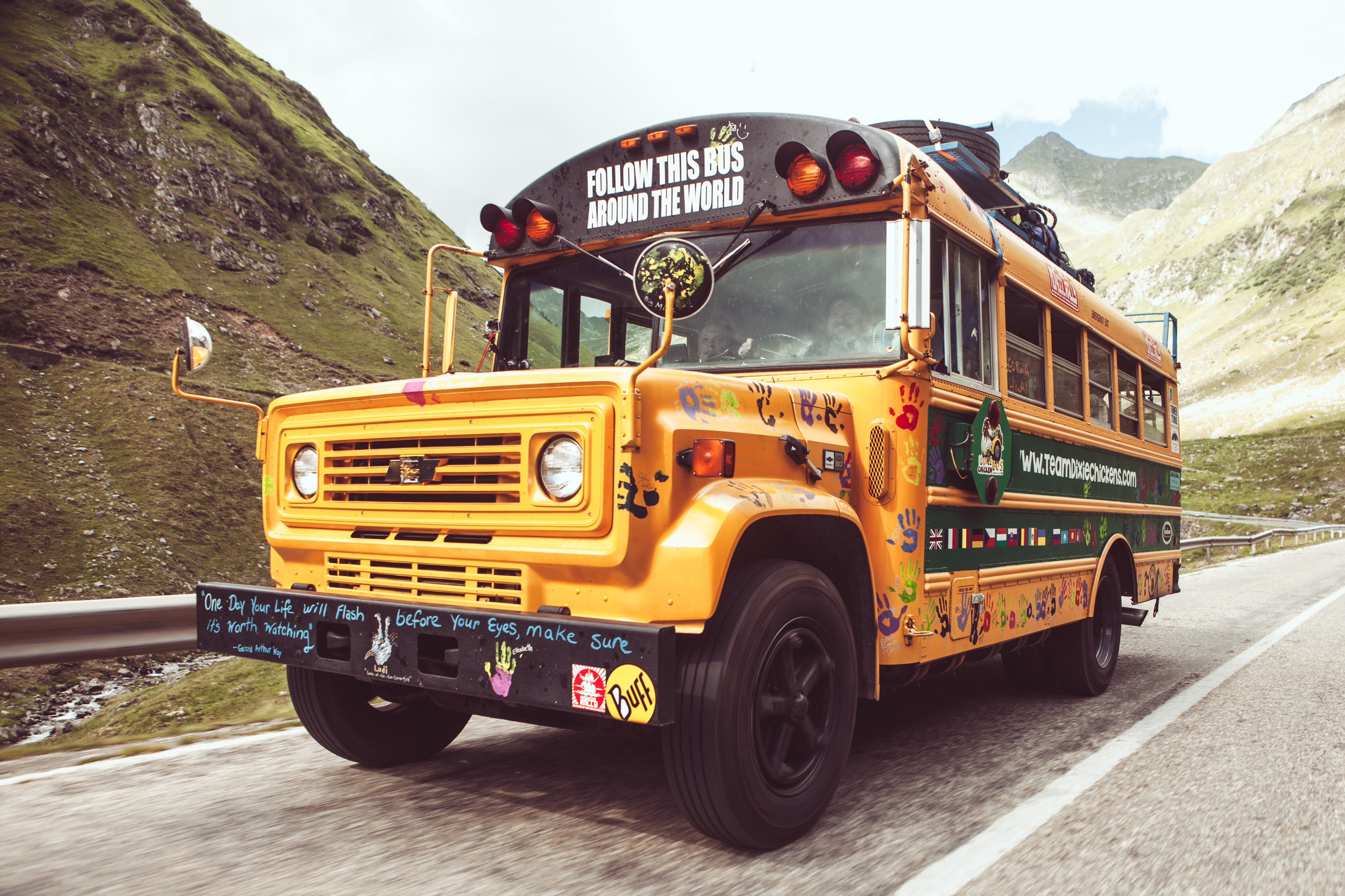 After developing an online friendship with Don and Sarah, a couple from South Carolina with a passion for adventure, Plan F got an invite to ride with them on their spectacular yellow school bus as they circumnavigated the globe in it. Meeting them both for the first time as he climbed aboard the bus at Bodium Castle in the UK, Dave travelled throughout Europe with the guys and sadly departed in Ukraine and flew home due to work commitments. From there they drove the bus through Russia, Kazakhstan, Mongolia before shipping it to Japan for a cruise around there too. You can read more about their adventures here http://www.teamdixiechickens.com
